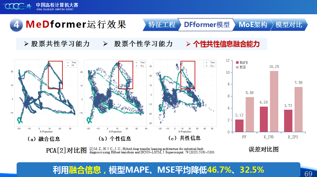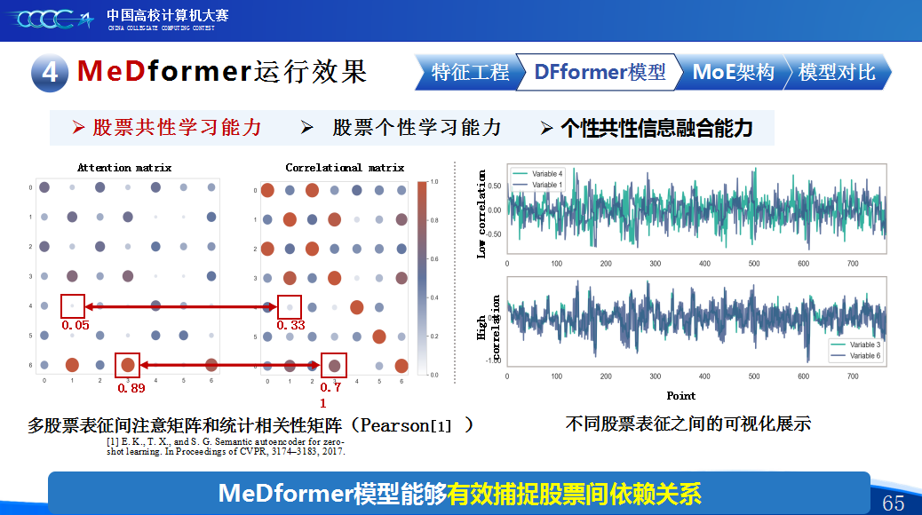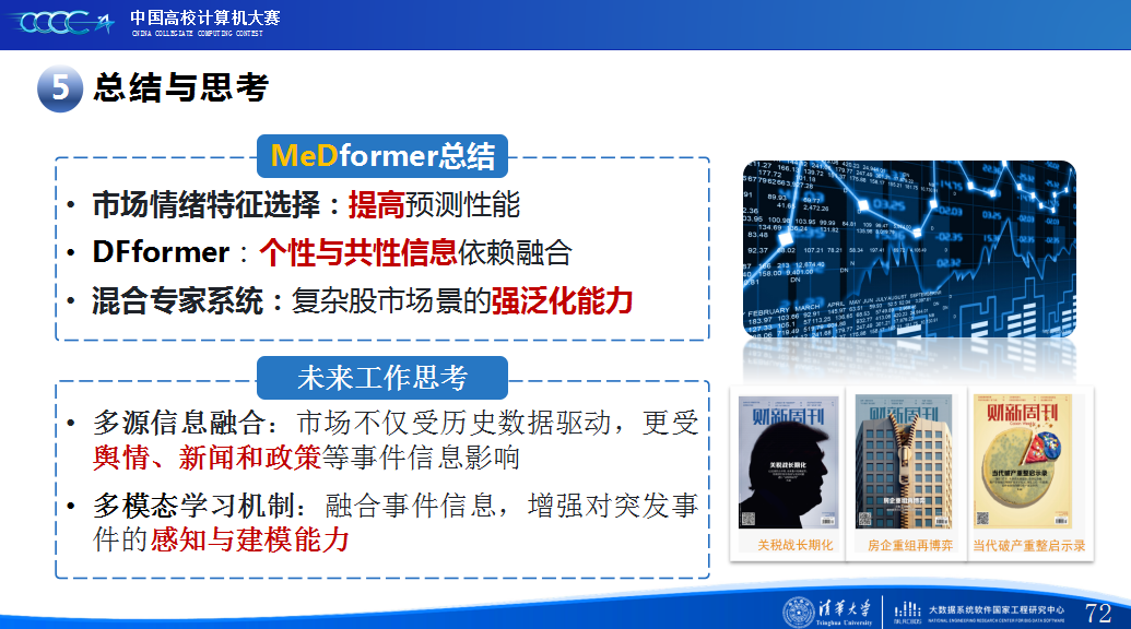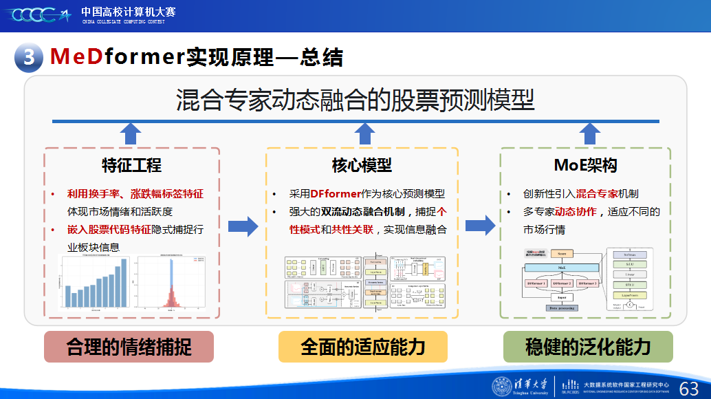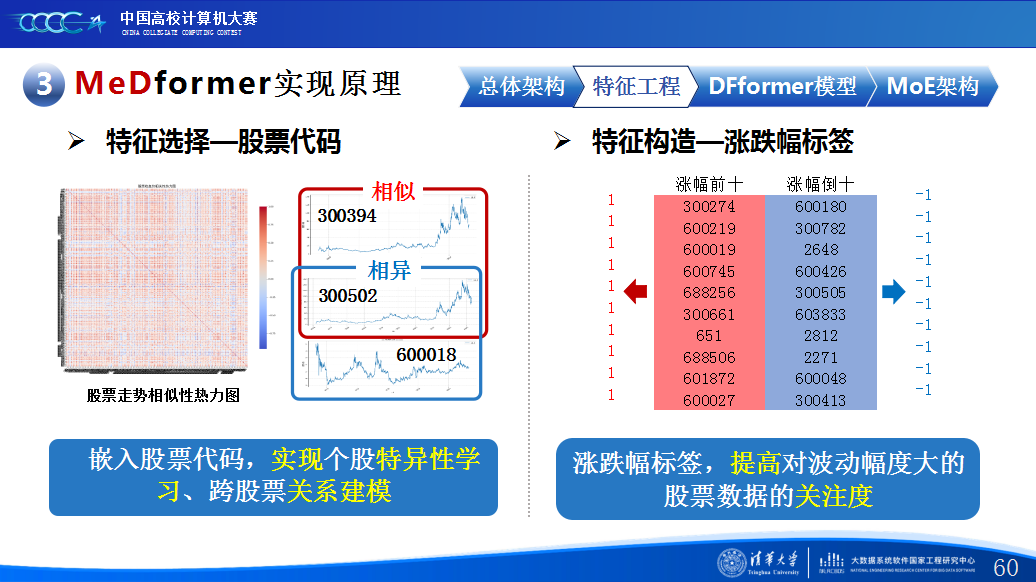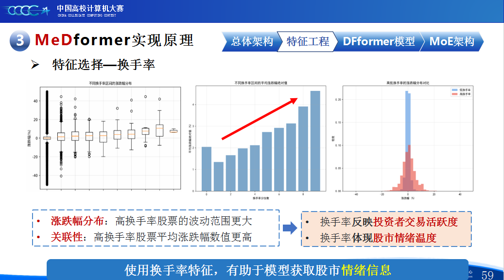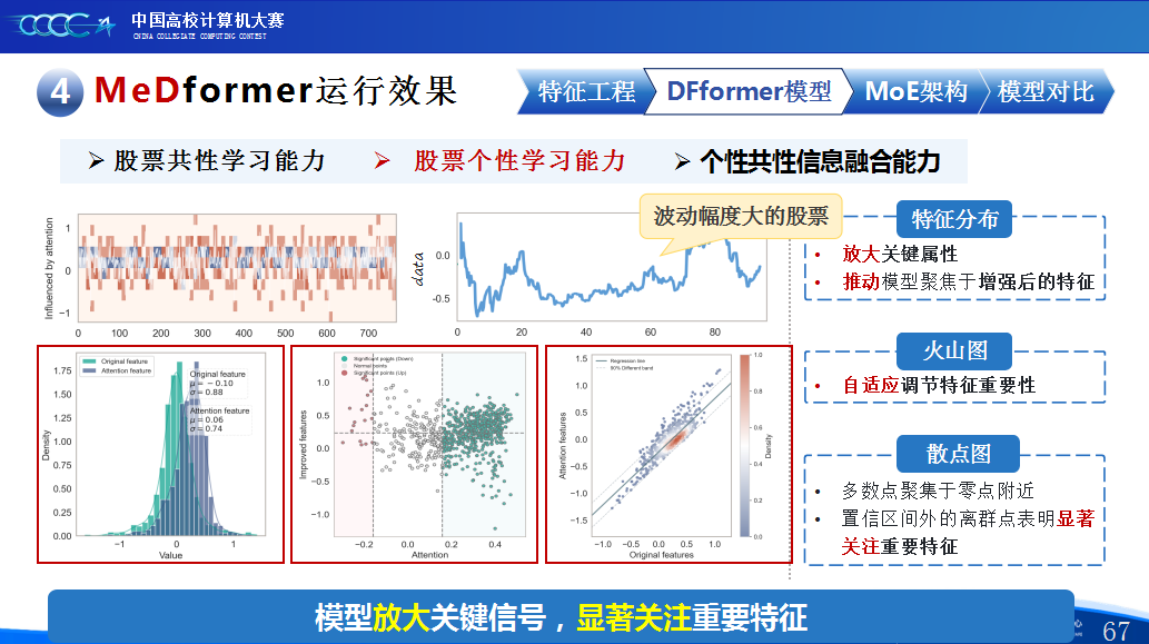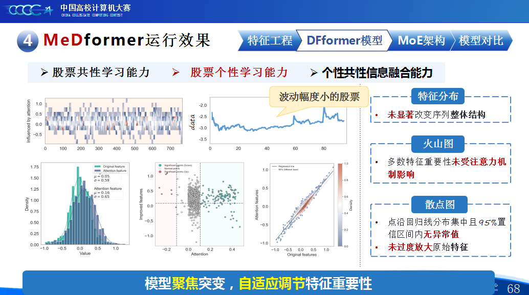 第二是我们团队的经验分享。在设计MeDformer的过程中,我们经历了多次迭代和优化,也积累了不少实战经验:1.特征工程是关键:我们使用了换手率作为情绪指标,发现高换手率股票波动更大,更能反映市场情绪;同时嵌入股票代码来隐式学习行业板块信息;还构造了涨跌幅标签来强化对极端波动的关注。这些特征显著提升了模型的感知能力。2.双流机制捕捉个性与共性:我们自研的DFformer模型采用双流结构,一流动态提取单支股票的时间模式(个性),另一流捕捉股票之间的关联(共性),最后通过动态融合机制将两者结合,大大提升了信息的利用效率。3.混合专家系统(MoE)提升鲁棒性:我们创新地引入了MoE架构,包含S-DF、M-DF、L-DF三个不同结构的专家模型,分别捕捉短期、中期、长期特征。通过动态选择机制,模型能适应不同市场风格,避免单一模型失效的风险。4.我们通过注意力矩阵、火山图、散点图等方式可视化模型决策过程,发现模型能自动聚焦关键时间点和特征,增强了结果的可信度和可解释性。通过本次大赛,我们不仅积累了宝贵的实践经验,还提升了算法设计和创新的能力,尤其意识到在将模型应用到实际场景中时,需要关注数据、行情等现实问题从而贴合实际需求。在和其他队伍的交流中,也极大地拓宽了我们的视野和思路,他们的巧思也给我们提供了新的启发。