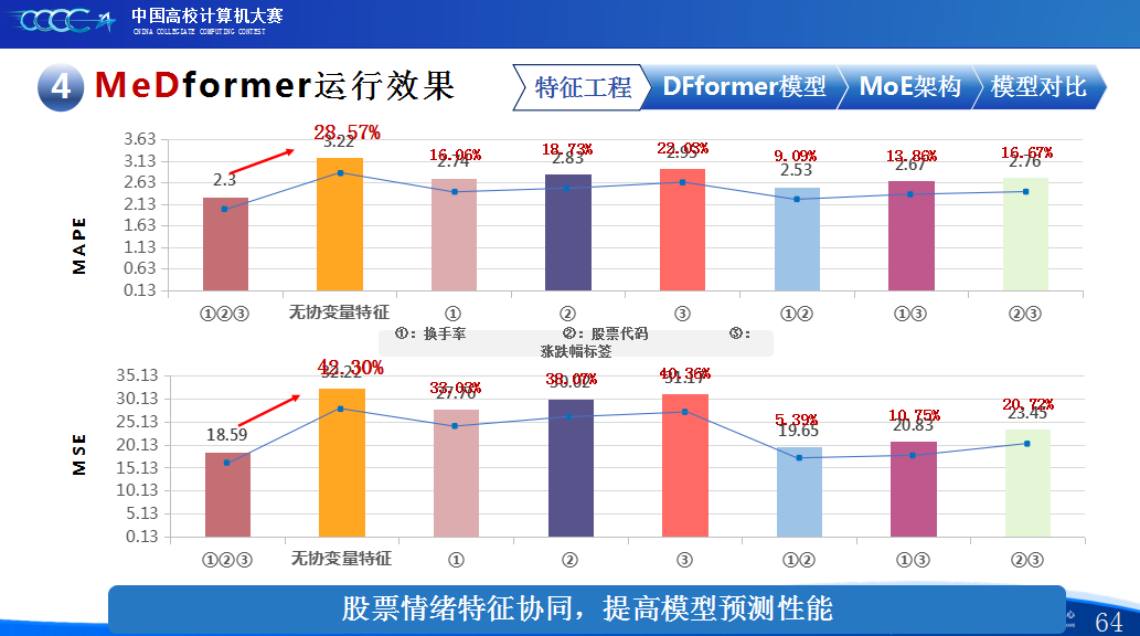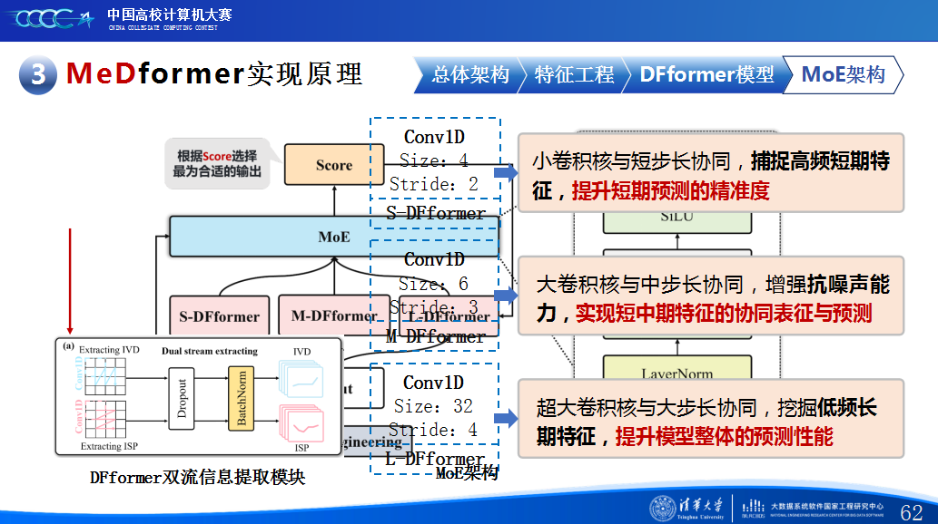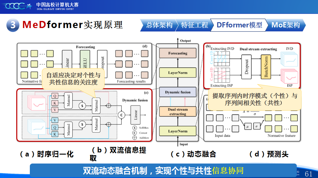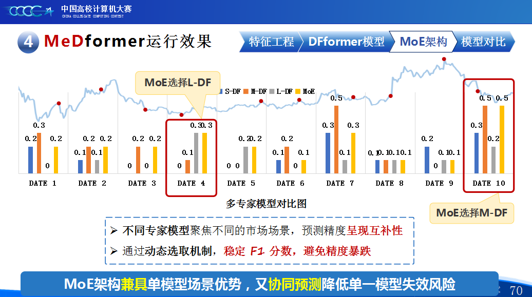 在实践过程中,团队积累了宝贵的经验。首先,他们强调特征工程的重要性,通过将换手率作为情绪指标、嵌入股票代码以学习行业板块信息,并构造涨跌幅标签来强化对极端波动的关注,显著提升了模型感知能力。其次,团队自研了DFformer模型,该模型采用双流结构,能动态提取单支股票的时间模式(个性)和捕捉股票之间的关联(共性,并通过动态融合机制高效结合两者。此外,为提升模型鲁棒性,他们创新地引入了包含S-DF、M-DF、L-DF三种结构的混合专家系统(MoE),使其能动态适应不同市场风格,避免单一模型失效。最后,团队还通过注意力矩阵、火山图等可视化手段,增强了模型决策过程的可信度和可解释性。
