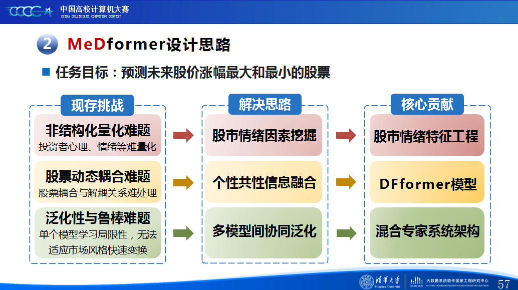 第一是我们对赛题的理解与兴趣。这次比赛的赛题是“预测未来股价涨幅最大和最小的股票”,这是一个非常具有挑战性也极具现实意义的题目。股票市场不仅受历史数据影响,还深受投资者情绪、市场热点、政策新闻等多重因素影响,是一个典型的多源、动态、非结构化的复杂系统。我们团队对此一直很感兴趣,尤其是如何将人工智能技术应用于真实的金融市场预测中。我们认为,传统的时序预测模型往往只关注历史价格,忽略了市场情绪和个股之间的关联,导致泛化能力不足。因此,我们决定从“情绪特征挖掘”和“多模型协同”两个角度入手,设计一个既能捕捉个股特性、又能理解市场共性的混合预测模型。