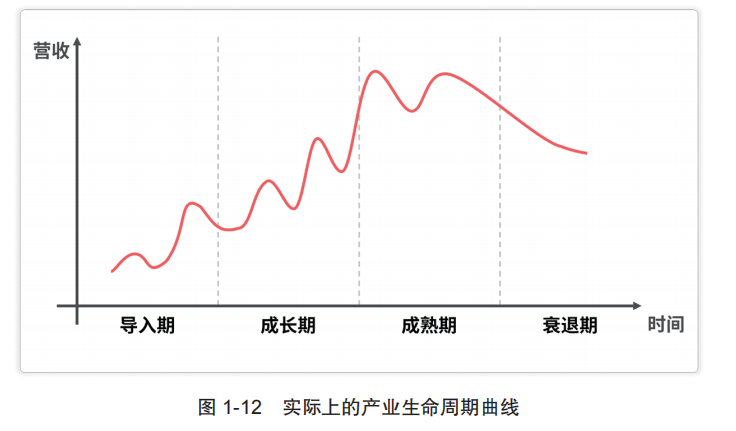 所以,实际上的产业生命周期曲线可能会像图 1-12 所呈现的那样。虽然整体形状仍然接近 S 形曲线,但在整体过程中,由于营收变化跌宕起伏,产业生命周期曲线不是一条光滑的 S 形曲线。