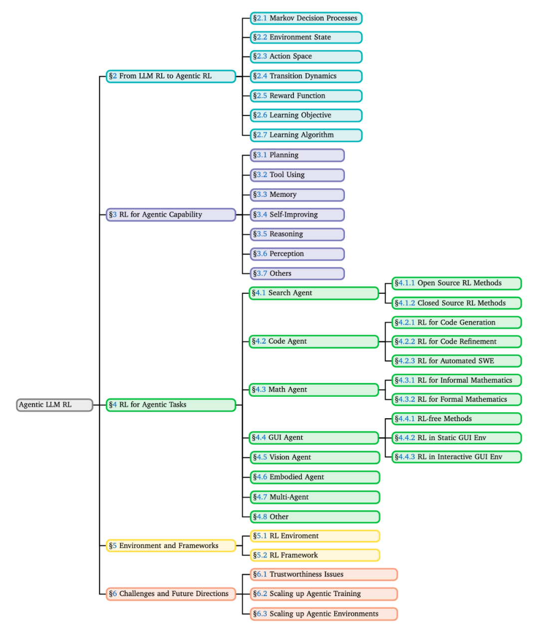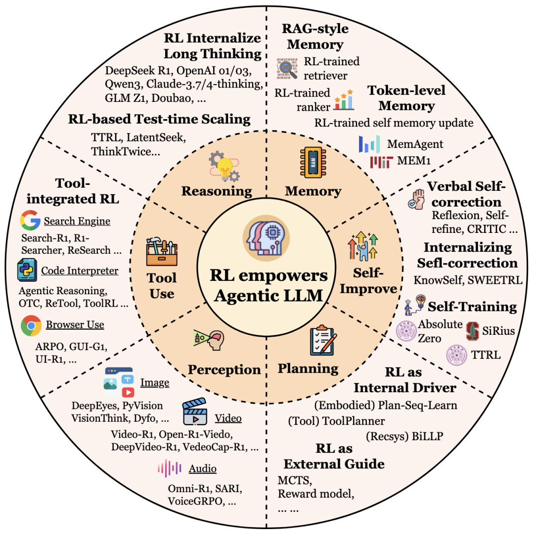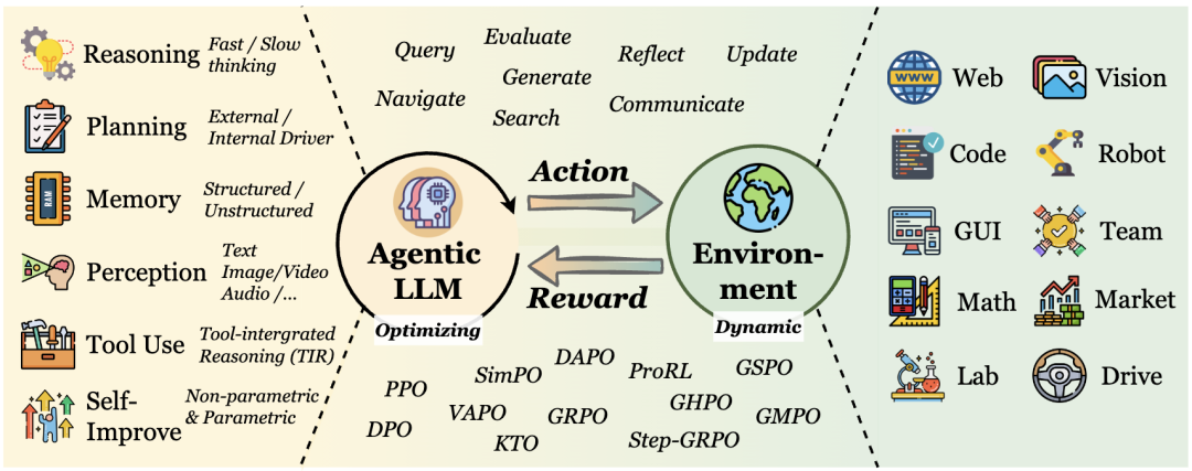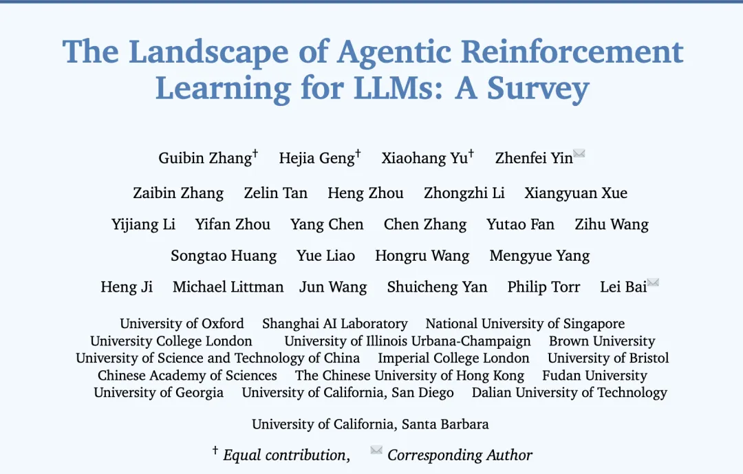 为了捋清这一新兴领域,一篇长达 100 页、由牛津大学、新加坡国立大学、伊利诺伊大学厄巴纳-香槟分校,伦敦大学学院、帝国理工学院、上海人工智能实验室等 16 家海内外顶级研究机构联合完成的最新综述论文,全面系统地梳理了作用于 LLM 的 Agentic RL 这一方向,覆盖 500 + 相关研究,构建了 Agentic RL 的理论框架、演化脉络与资源版图,并讨论了可信性、扩展性和复杂环境等未来挑战。