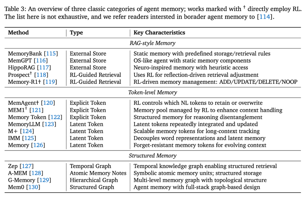 3. 记忆(Memory):保持上下文连贯并积累知识,包括基于外部数据库检索记忆、Token 级别记忆和结构化记忆。其中,值得关注的工作包括来自字节跳动的 MemAgent 和麻省理工大学的 MEM1,他们都通过强化学习让 LLM Agent 拥有自行管理记忆窗口的能力。