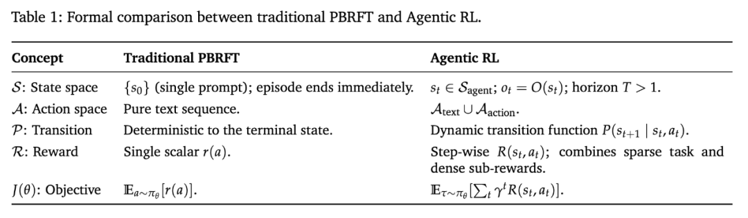 该综述首先给出范式迁移的形式化定义:早期 RL 研究多基于 PBRFT 范式,可被视为退化的单步 MDP(单 prompt、一次性文本输出、立即终止),而 Agentic RL 则将 LLM 置于部分可观测马尔可夫决策过程(POMDP)下进行多步交互: