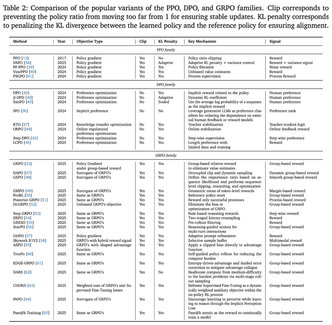 在强化学习优化算法层面,当前实践形成了一条从通用策略梯度到偏好优化的谱系,Table 2 汇总比较了三类算法家族及其代表方法,便于读者快速对照「训练用什么算法」与「对齐目标/信号形态」 的对应关系。