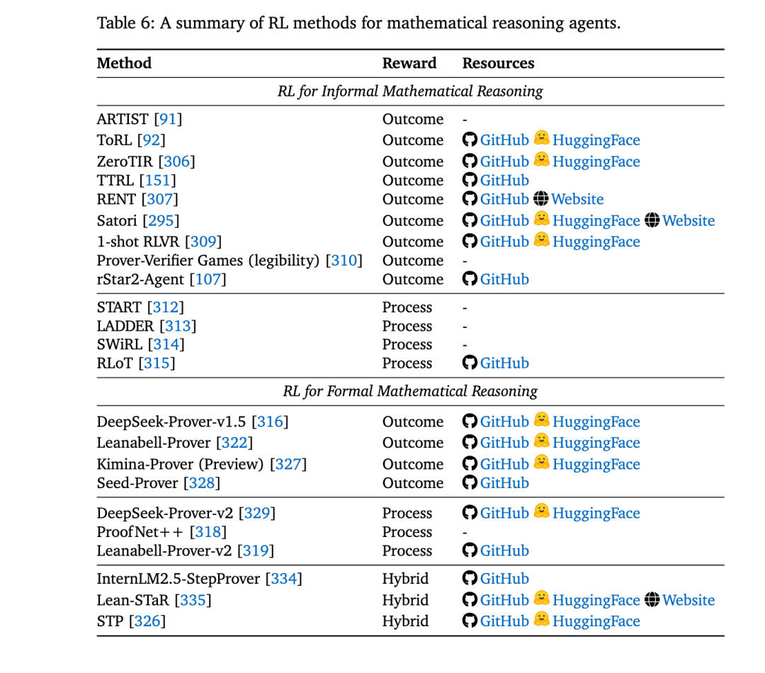 数学:在非形式化 (informal) 推理中,利用正确率或中间过程奖励来塑造推理轨迹;在形式化 (formal) 推理中,交互式定理证明器 (ITPs) 提供可验证的二值信号,使智能体能在严格规则下探索证明路径;