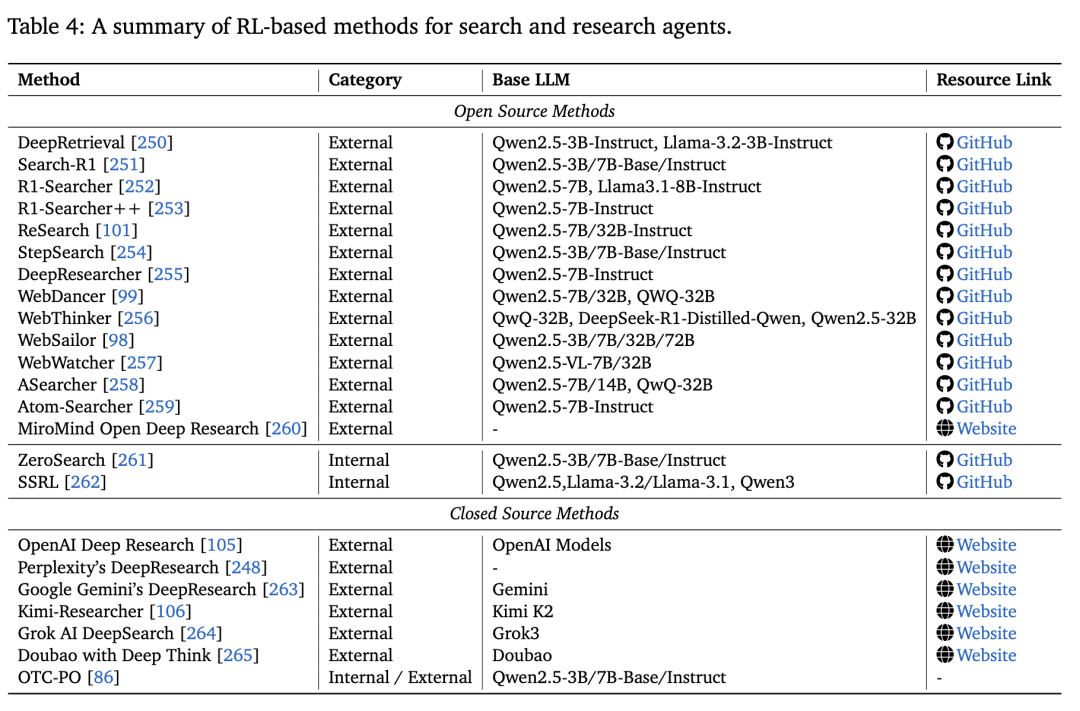 其他探索:RL 也被应用于数据分析、科学发现等场景,显示出 Agentic RL 在更多任务中的潜在适应性。