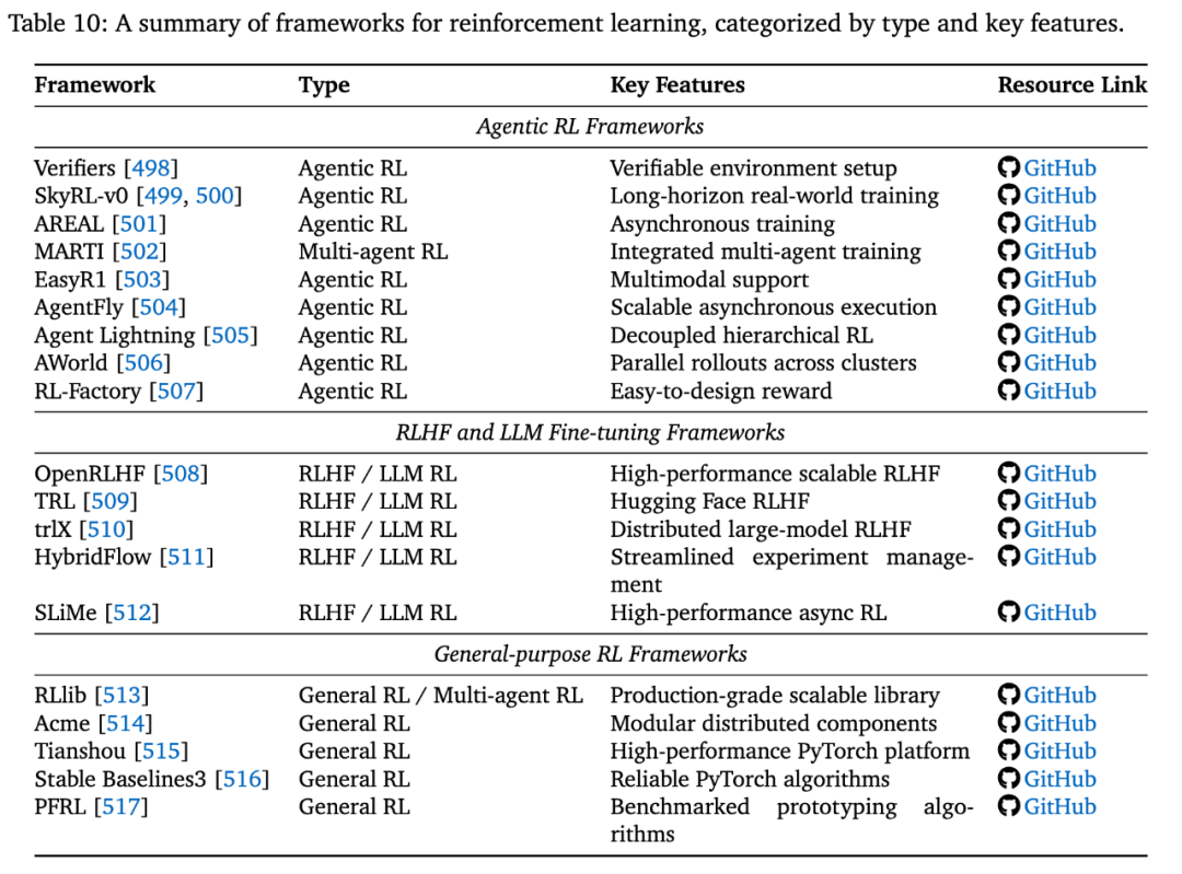此外,这份综述还整合了 500+ 篇相关研究,并在 GitHub 上开源了 Awesome-AgenticLLM-RL-Papers,将论文、环境、基准与框架一站式汇总,为后续研究提供了全景式的参考地图。