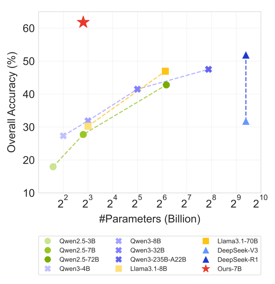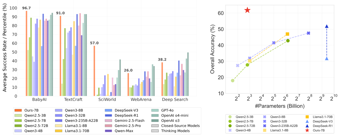 本文框架和方法通过后训练,显著提升了7B参数规模开源模型的能力,不仅超过了其他同等规模的开源模型,且显著优于参数规模近其十倍的更大模型。