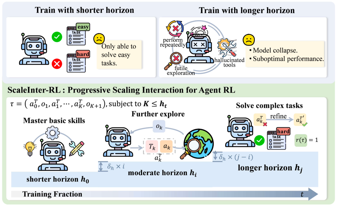 引入 ScalingInter-RL 方法:这是一种基于渐进式交互轮数拓展的强化学习训练方法,使智能体能够逐步适应环境,优化其交互模式、行为和技能,最终在探索和利用之间实现更好的平衡。
