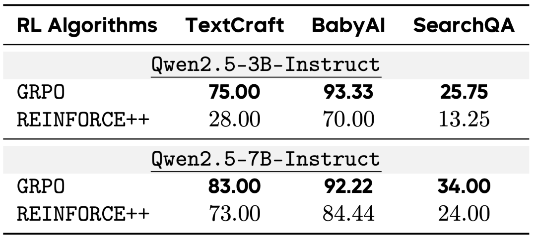 不同 RL 算法比较:对比 GRPO 与 REINFORCE++ 两种主流 RL 算法发现,GRPO 在 TextCraft、BabyAI 和 SearchQA 任务上均显著优于 REINFORCE++。即使 3B 参数的 GRPO 模型,其性能也超过 7B 参数的 REINFORCE++ 模型,表明算法选择对性能的影响可能大于模型规模。