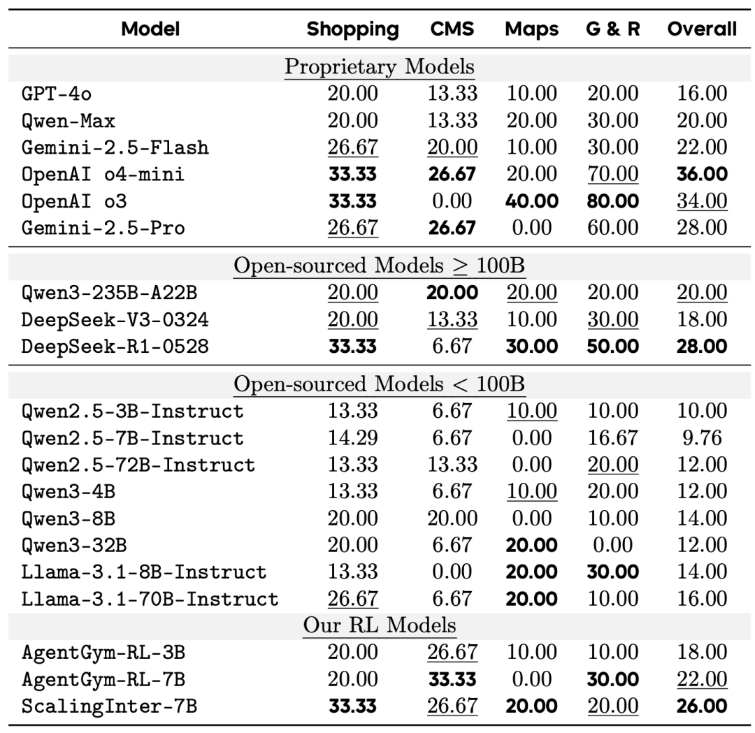 商业模型、开源模型以及本文强化学习模型在不同智能体任务中的表现。