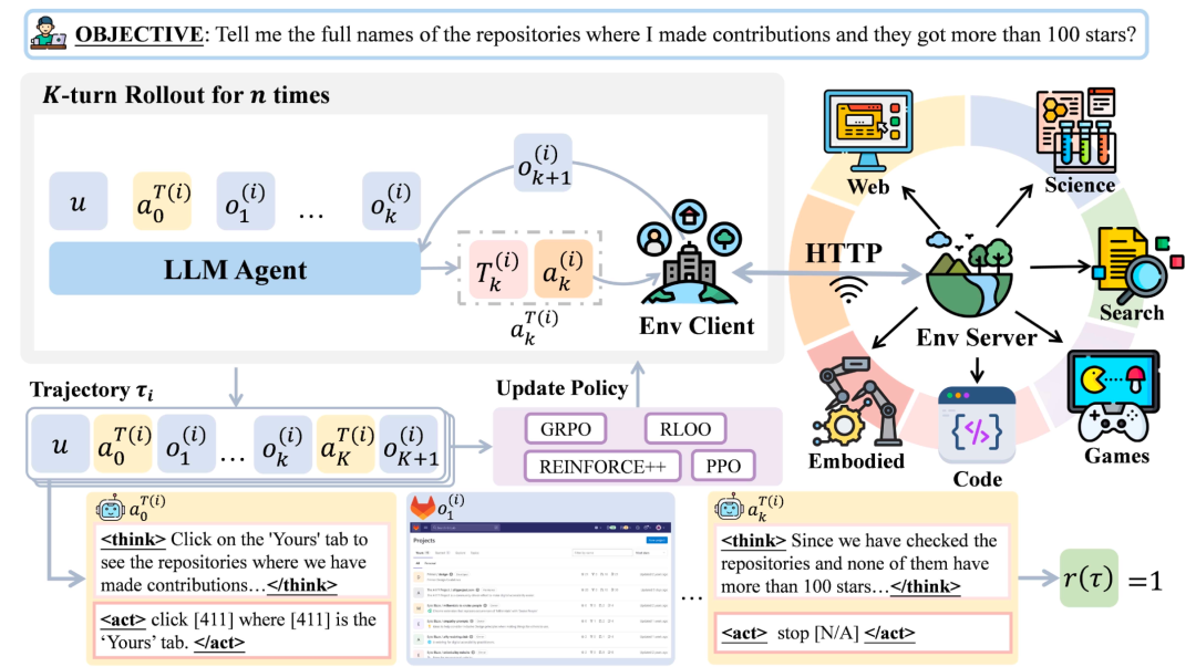 然而, 当前大多数现有研究局限于单轮任务,缺乏与复杂环境的多轮交互机制。虽然最近有研究尝试扩展 RL 以训练具有多轮能力的 LLM 智能体,但这些工作仍然存在任务场景单一、环境适配性差、优化稳定性低等问题,使得智能体无法接触到足够丰富的环境信息,难以生成和利用第一手经验,自然难以应对现实世界复杂多变的任务。因此,该领域目前仍然缺乏一个统一的、端到端的、交互式多轮 RL 框架,能够在广泛的实际场景和环境中有效地从头开始训练 LLM 智能体,而无需依赖监督微调(SFT)作为初步步骤。