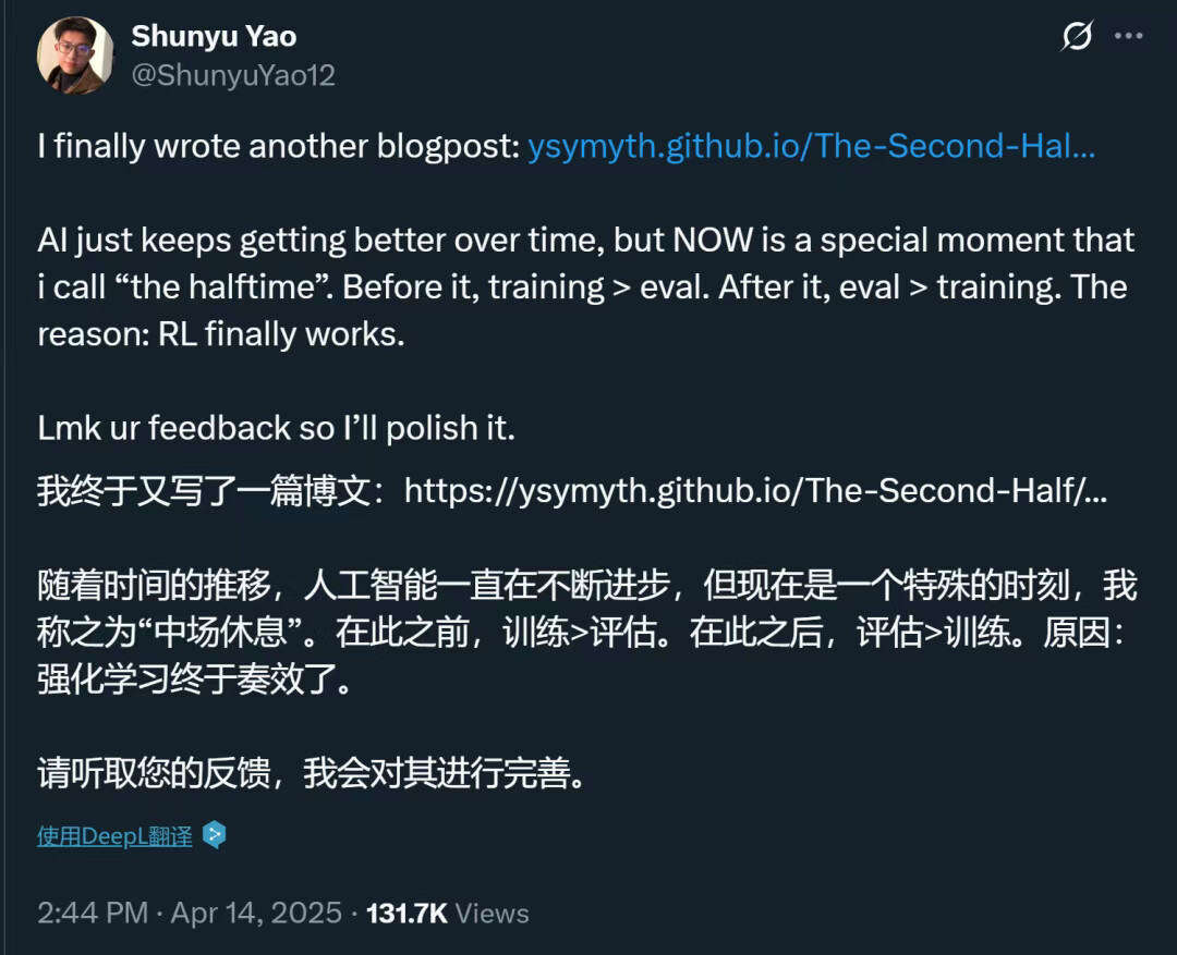 今年 4 月,,被广泛认为是 AI 研究范式转折的标志性论述,其核心理论是 AI 领域正在从「训练更强的模型」转向「定义和评估真正有用的任务」。