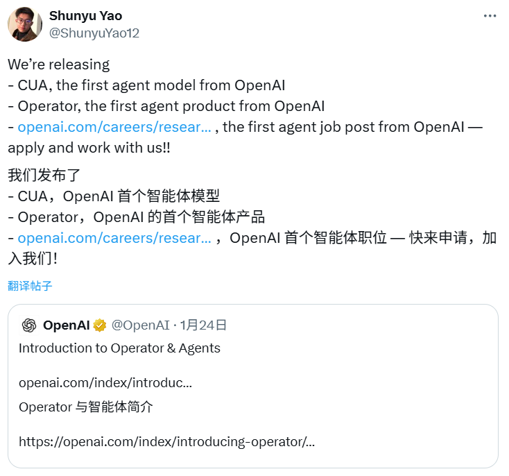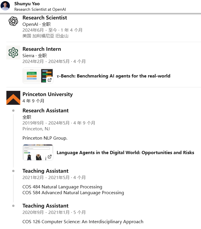 姚顺雨,毕业于清华姚班,普林斯顿大学计算机科学博士,2024 年 8 月加入 OpenAI。