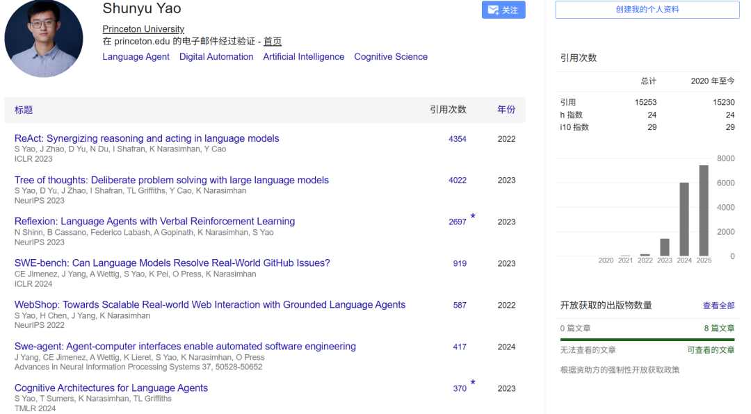 此外,他还参与构建了著名软件工程基准 SWE-Bench 和模拟电子商务网站环境 WebShop,推动了 AI 智能体的发展。截至目前,姚顺雨的论文总引用量已经超过了 1.5 万。