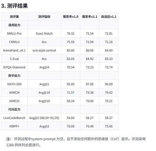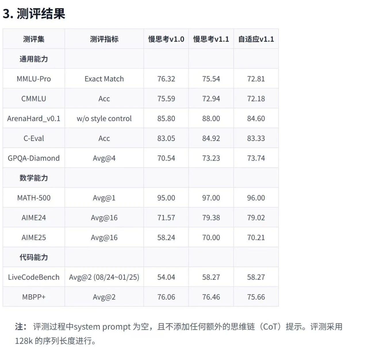 从官方公布的评测结果来看,新模型展示了强大的性能,尤其是在数学和代码能力上。其「慢思考v1.1」版本在数学评测AIME24和AIME25上分别取得79.38和70.00的高分,在代码能力评测LiveCodeBench上也达到了58.27分,全面超越了v1.0版本。