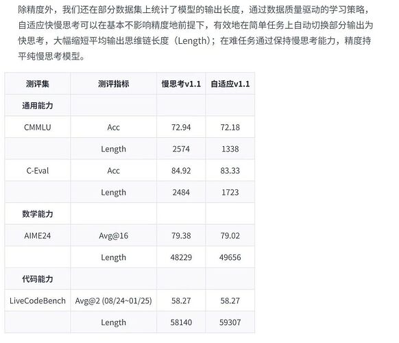 评测数据显示,在基本不影响精度的前提下,「自适应」模型能在简单任务上(如C-Eval)大幅缩短输出长度,从而降低推理成本和时间;而在困难任务上(如AIME24),则能保持与「慢思考」版本相当的输出长度和思考能力,以确保性能。