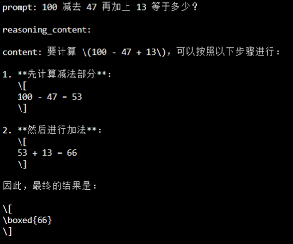 2)慢思考:步步为营。面对稍微复杂的计算题,如「100减去47再加上13等于多少?」,模型则会自动切换到「慢思考」模式。它会像草稿纸一样,清晰地列出计算步骤,最终得出正确答案66。整个思考过程一目了然,保证了结果的准确性。
