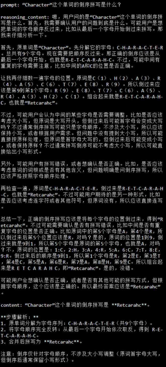 3)慢思考:应对复杂逻辑。对于「如何倒序拼写一个单词?」这类需要逻辑推理的复杂问题,openPangu会调用强大的「慢思考」能力,对问题进行庖丁解牛般的拆解:首先识别单词的每一个字母,然后从最后一个字母开始重新排列,最终精准地完成倒序任务。这个过程展示了模型处理复杂指令的严谨逻辑。