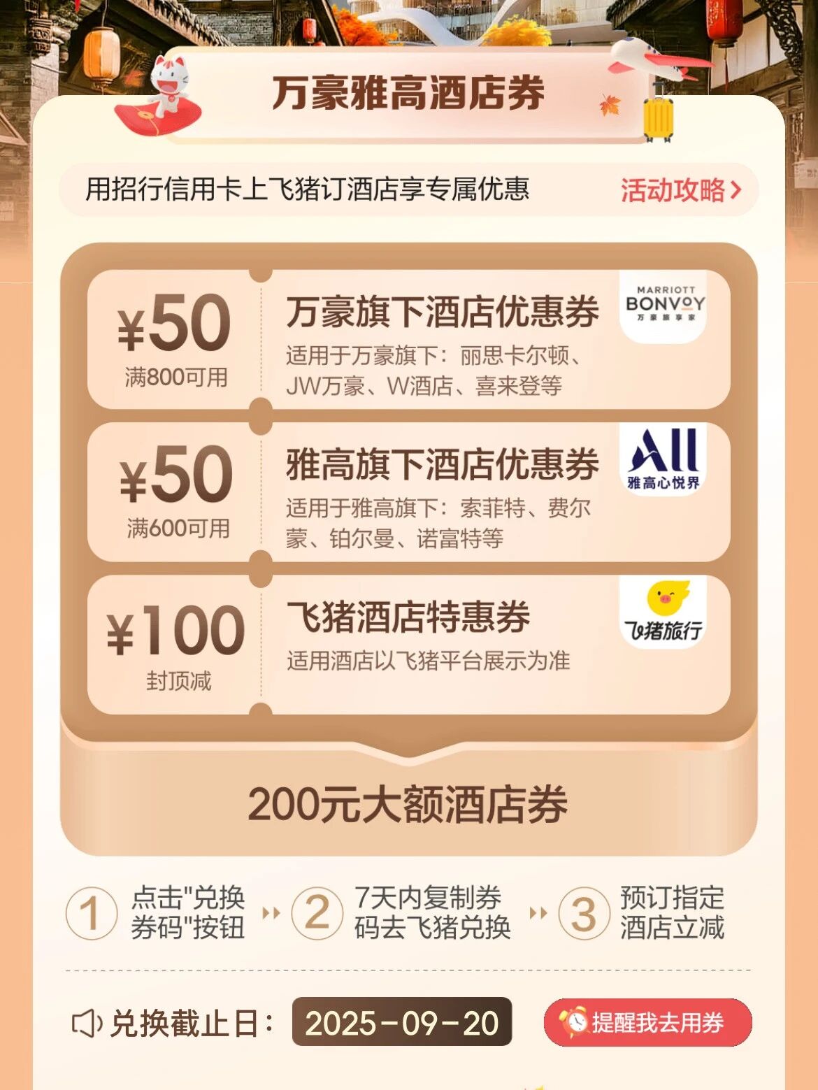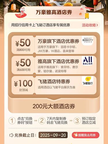 我之前领过类似的券,200块钱嘛,得看怎么用。如果能叠加其他活动,比如酒店自己的促销或者飞猪自己的满减,那200块钱就能省不少。但如果是一个只能单用,而且必须消费满1000才减200的,那对于住一两晚快捷酒店的朋友来说可能就没啥用。对于我们经常出差或者旅游住万豪、雅高这种酒店的,一晚大几百甚至上千是常态,200块钱房费直接减掉还是挺香的!蚊子腿也是肉啊,尤其是在酒店这种大额消费上,省下200都能多吃顿饭了!