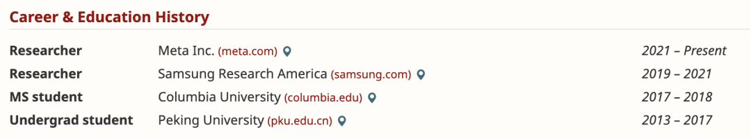 他本科毕业于北京大学,后在哥伦比亚大学攻读硕士学位,毕业后去了三星美国研究员担任研究员,2021 年加入 Meta。