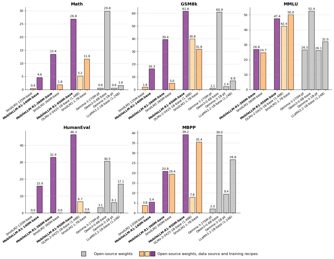 Meta开源MobileLLM-R1,不到1B参数,用1/10训练数据量,在数学编程等领域性能超越竞品,小模型部署潜力巨大。