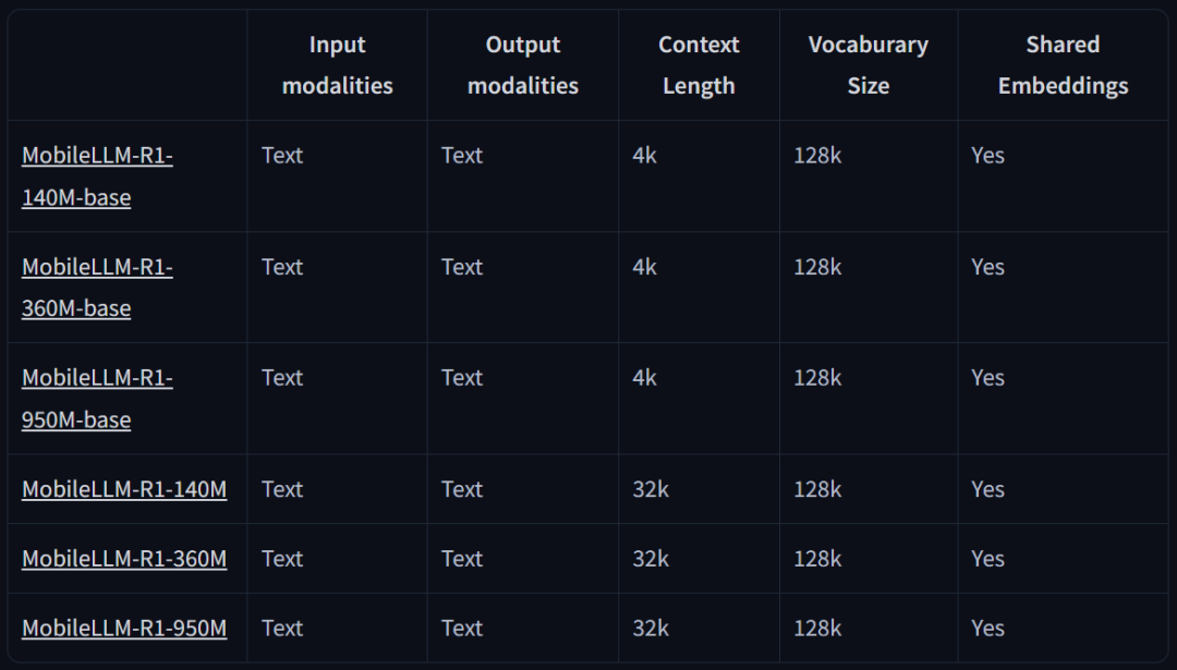 这是 MobileLLM 的全新高效推理模型系列,包含两类模型:基础模型 MobileLLM-R1-140M-base、MobileLLM-R1-360M-base、MobileLLM-R1-950M-base 和它们相应的最终模型版。