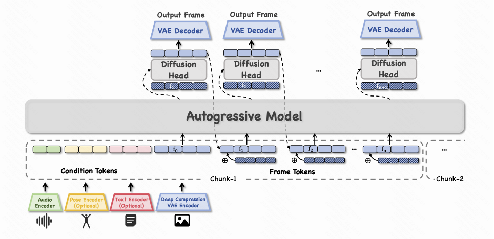 模型可嵌套任意类似大语言模型的自回归架构,逐帧预测潜在表示,再由一个轻量级扩散头进行去噪和高清渲染。这种设计既保证了生成的连贯性,也大幅降低了计算延迟,适合实时流式生成。