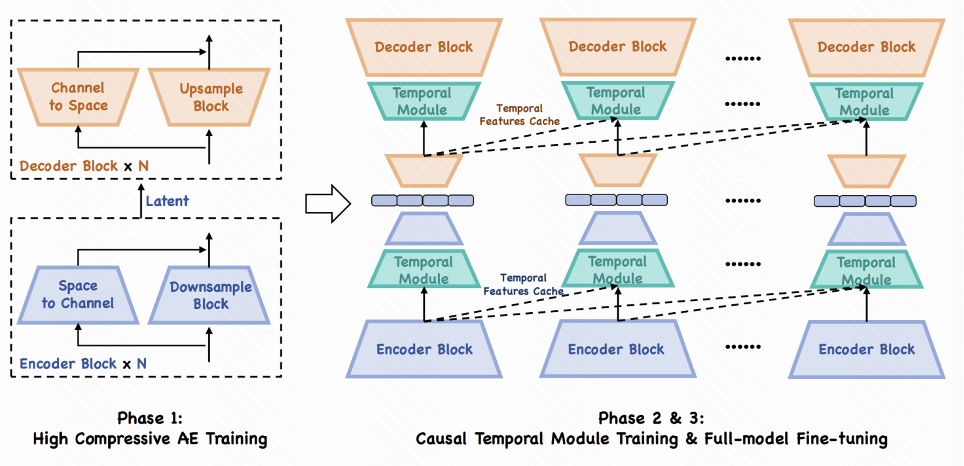 为实现高效的自回归建模,团队设计了压缩比高达 64 倍的 DC-AE,将每帧图像表示为最多 60 个令牌,支持分辨率最高达 384×640 的图像重建,并引入因果时序卷积与 RoPE 注意力机制保障时序一致性。