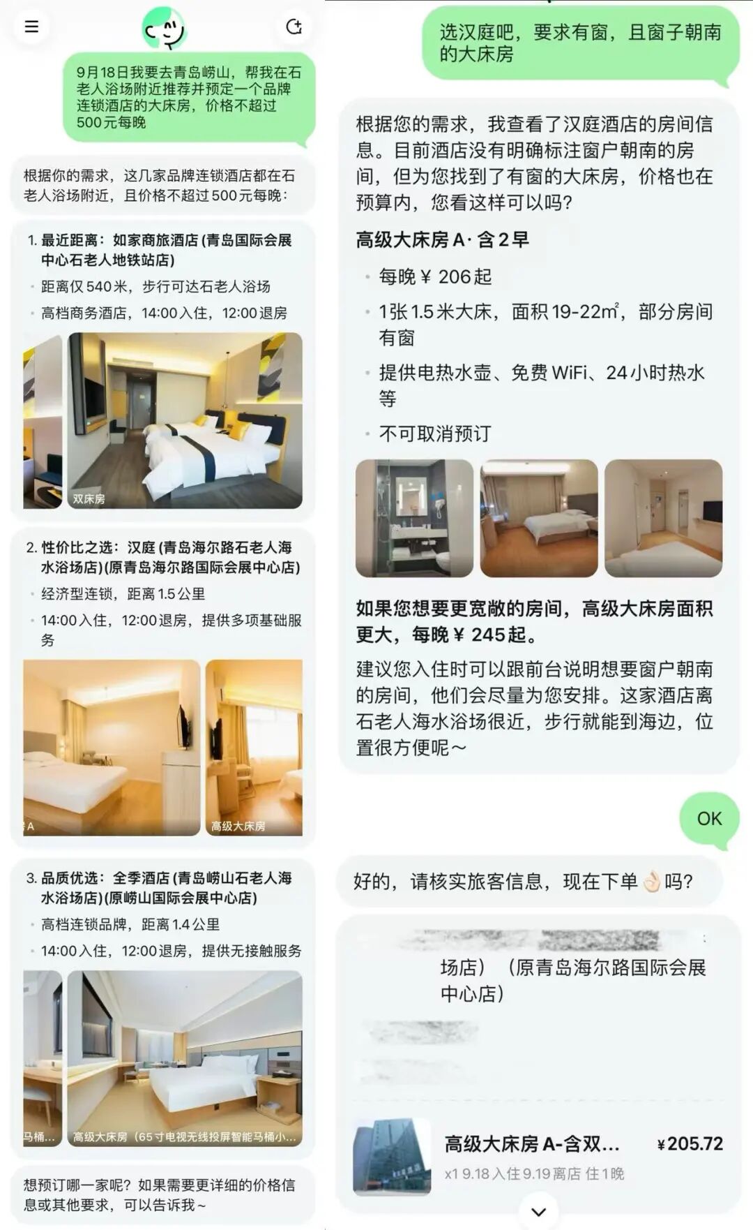 小美还有推荐、预订功能。比如设定一个场景:周一我要去青岛崂山,让它帮我在石老人浴场附近推荐并预订一个品牌连锁酒店的大床房,价格在每晚 500 元以内。