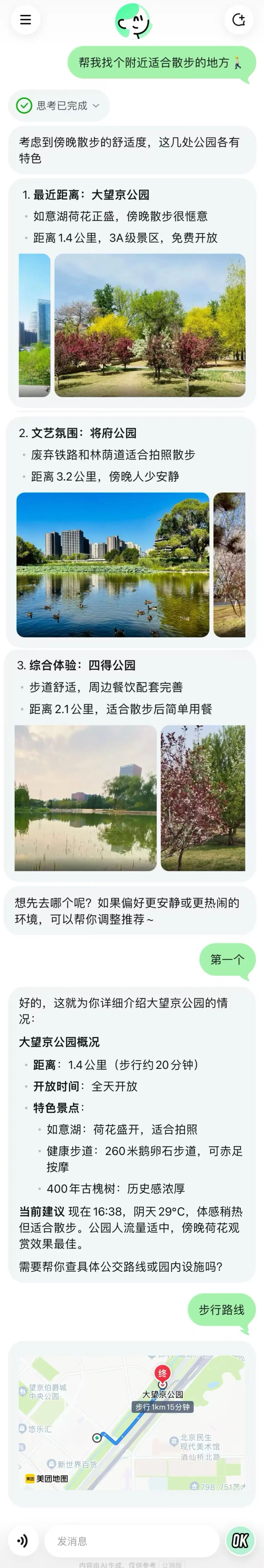 经过多番考量,小美挑选了距离最近、有文艺氛围、综合体验高的三处公园,在我们做出选择后,它就开始介绍大望京公园的概况以及当前的天气、人流量,并给出相应建议,甚至它还能提供导航路线图。
