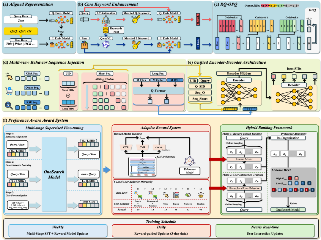 2. **多视角用户行为序列注入策略**:传统用户ID缺乏语义信息,难以捕捉用户偏好。OneSearch通过结合用户显式的短期行为(近期搜索、点击)和隐式的长期行为序列(历史购买),构建了富有语义信息的“用户标识”。它以高效的SID维度嵌入方式,全面而精准地建模用户兴趣,即使是新用户也能获得更好的体验。