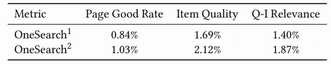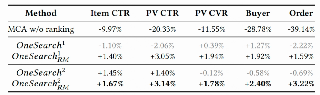 为了验证 RQ-OPQ 编码和用户序列引入的有效性,OneSearch 先后进行了两版实验,v1 版本仅使用 RQ 编码,取得了和线上级联式系统相近的效果;引入 RQ-OPQ 编码和用户序列建模后,v2 版本在 CTR 和 CVR 上有了显著的提升;额外地,在生成式模型的基础上进一步引入奖励系统,能获得转化指标的全面提升,最终版本订单量提升 3.22%,买家数提升 2.4%。