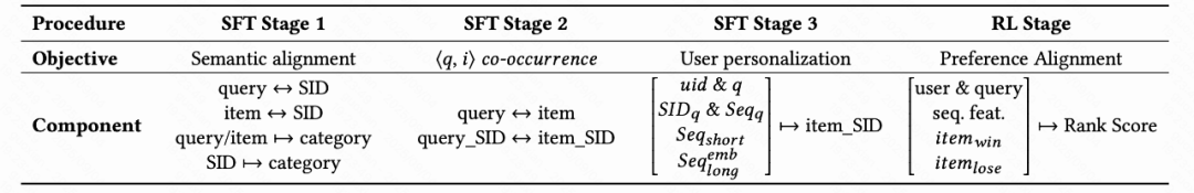 用于搜索的生成式模型,需要同时准确把握〈query, item〉对的相关性以及用户的个性化偏好。OneSearch 创新性地设计了三阶段 SFT 训练任务:分别实现语义内容对齐、协同信息对齐、用户个性化建模。这就类似于 “上课” 的过程,从易到难,进行课程学习。