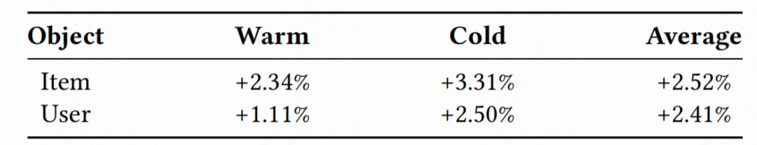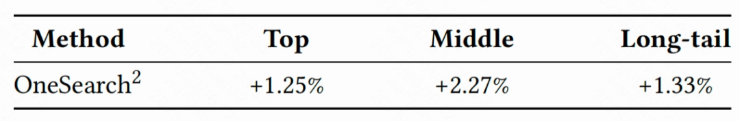 OneSearch 在绝大多数行业类别中均带来 CTR 的稳定提升,展现出良好的泛化能力。按 Query 频次、商品冷启动及用户层级下探表明,OneSearch 在高、中、低频 query 上均实现了 CTR 提升,尤其在中长尾 query 上的改善更为显著。此外,该系统在冷启动(cold-start)场景下表现尤为突出,效果显著优于常规(warm)场景,说明生成式检索模型能够更有效地应对长尾用户和新上架商品的排序挑战。