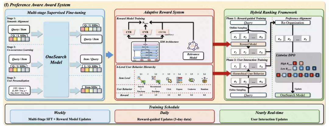 3. 引入偏好感知奖励系统(PARS):OneSearch通过多阶段监督微调(SFT)和自适应奖励强化学习机制,让生成式模型不仅理解Query与Item的相关性,还能根据用户个性化偏好进行排序。它将用户行为划分为不同等级并赋予动态奖励权重,并通过奖励模型对齐线上精排分布,最终突破排序性能上限。