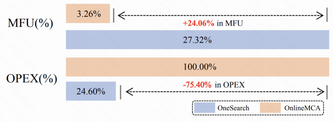 在人工评测中,OneSearch 系列模型不仅在 CVR 和 CTR 上表现优异,同时在页面整体满意度、商品质量及 query-item 相关性方面均显著优于线上级联式系统。此外,在线性能方面,机器计算效率(MFU)提升显著,从 3.26% 提高到 24.06%,相对提升达 8 倍;线上推理成本(OPEX)降低 75.40%,资源利用效率显著优化。