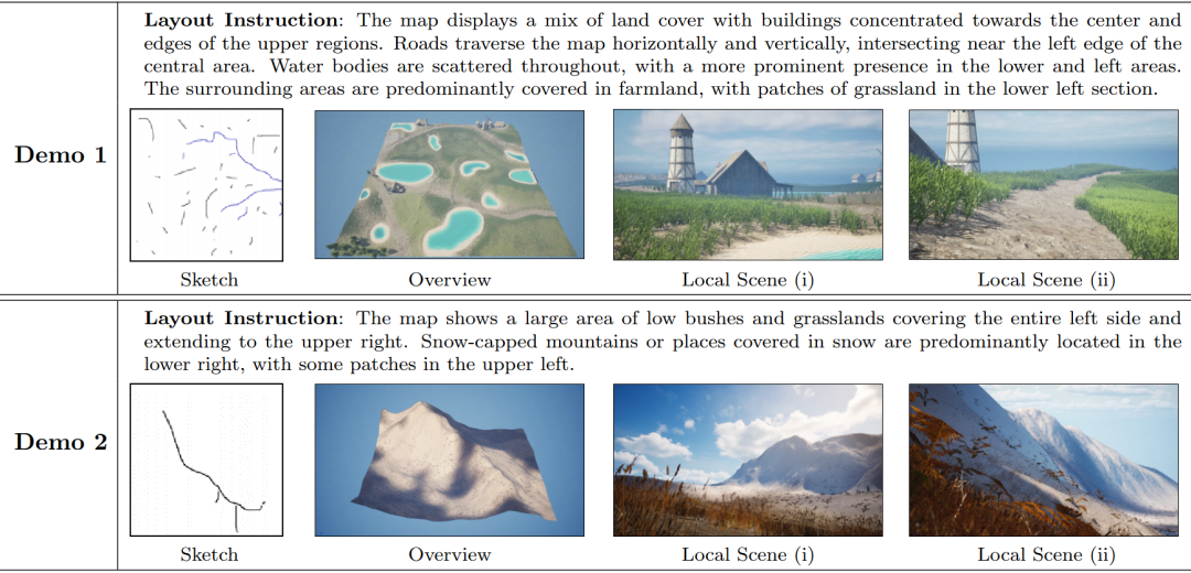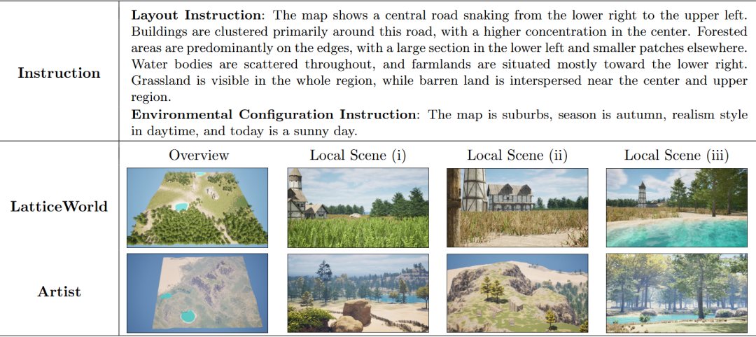 下面的表格展示了 LatticeWorld 在不同多模态布局指令下的场景生成能力,通过 $$32\times 32$$ 的符号矩阵编码空间关系,结合文本和视觉输入进行场景生成,所有布局均在 UE5 中渲染。