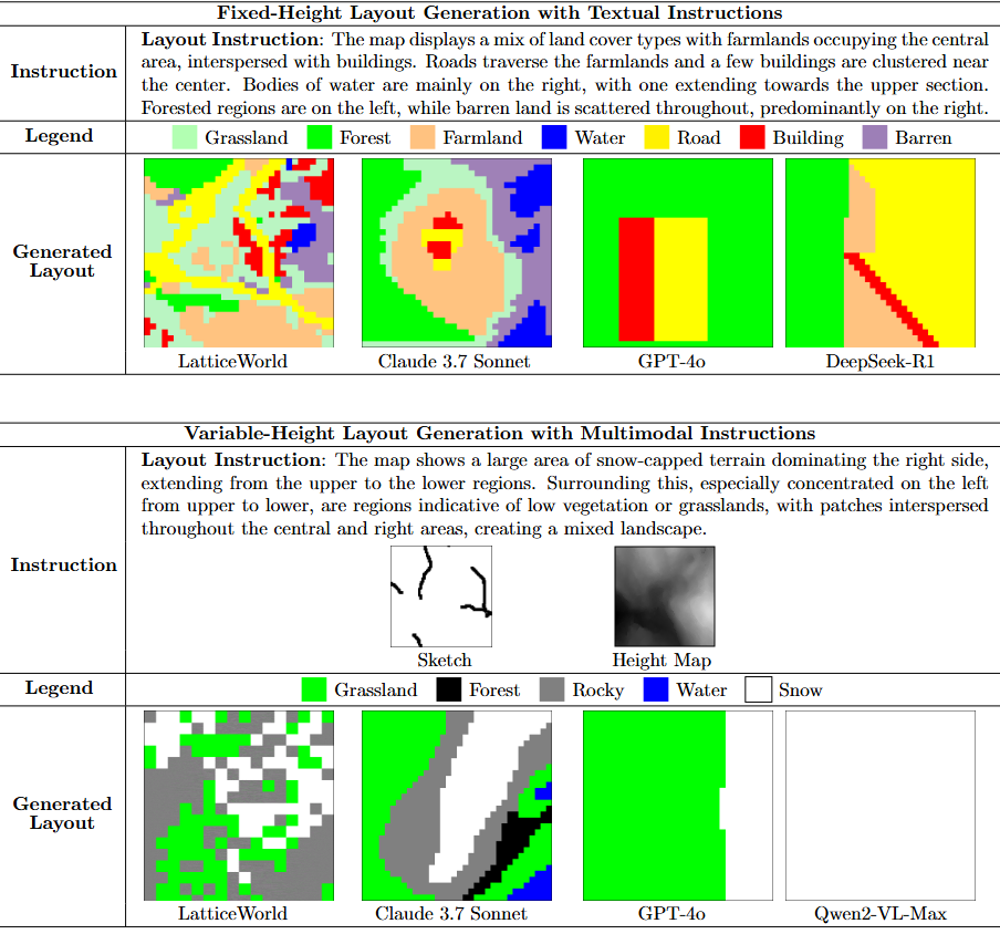 文中将 LatticeWorld 与 GPT-4o、Claude 3.7 Sonnet、DeepSeek-R1 和 Qwen2-VL-Max 等模型进行对比,在固定高度条件(仅文本描述)和可变高度条件(草图所对应转化成的高度图的视觉信号)下测试文本到布局的生成能力。结果显示 LatticeWorld 在生成准确布局方面表现更优。