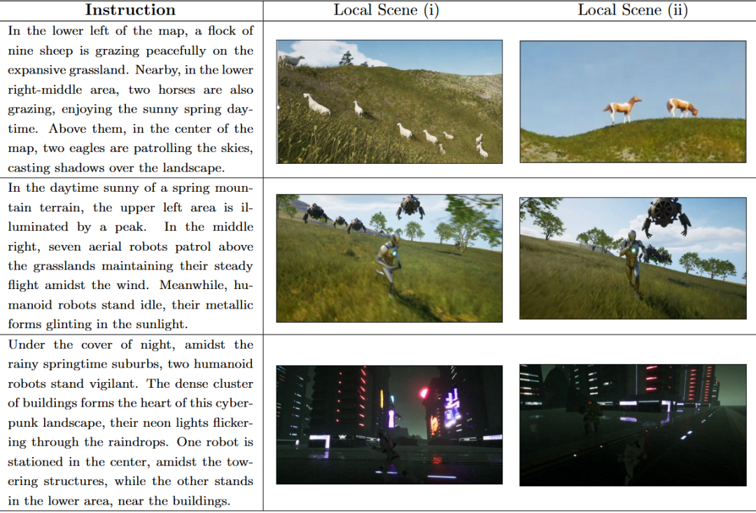 智能体参数生成:该框架能够生成动态智能体配置信息,包括智能体类别分类 (人形机器人、机器狗、动物等)、数量、行为状态 (静止、移动等) 和空间位置等。这些参数生成受到场景属性约束和视觉条件限制,确保智能体的正确布置,例如水生动物仅出现在水体区域。
