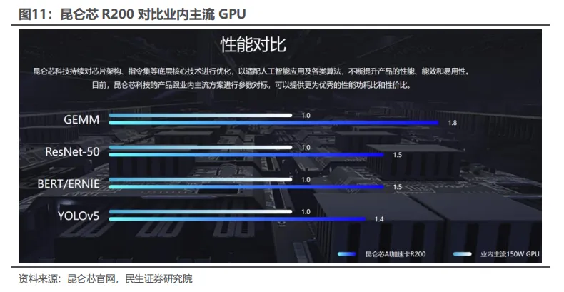 寒武纪芯片可应用于视觉、语音、自然语言处理、推荐系统、搜索、传统机器学习等多种应用领域。其产品强调高性能、低功耗、高能效比、可扩展性、自适应精度训练和小体积部署在多个行业已有实际部署案例。