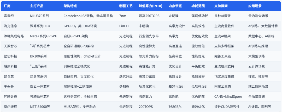 针对国内市场,文章深入剖析了多家代表性国产AI算力芯片企业,包括寒武纪、海光信息、沐曦集成电路、天数智芯、壁仞科技、燧原科技、昆仑芯、平头哥、昇腾计算产业链和摩尔线程。每家企业都有其独特的技术路线、产品定位、性能特点和生态建设策略。例如,寒武纪以自主指令集架构和云边端产品矩阵为特点;海光信息则以兼容“类CUDA”环境的GPGPU架构降低用户迁移成本;昇腾计算产业链则致力于构建从芯片到应用的完整全栈生态。