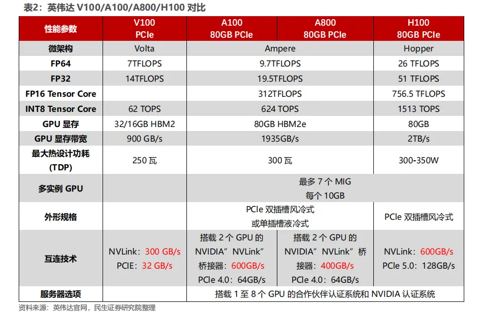 华为昇腾打造了芯片+硬件+软件+应用的全栈生态系统。昇腾系列芯片包括训练和推理产品,基于达芬奇架构,支持从边缘到数据中心的全面部署。华为主打 AI 芯片产品有昇腾310 和910B。310 偏推理,当前主打产品为 910B,拥有FP32 和 FP16 两种精度算力,可以满足大模型训练需求。910B 单卡和单台服务器性能对标 A800/A100。