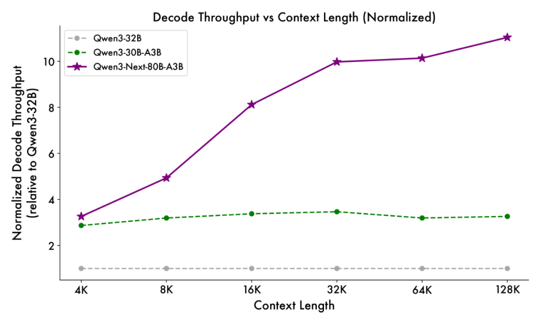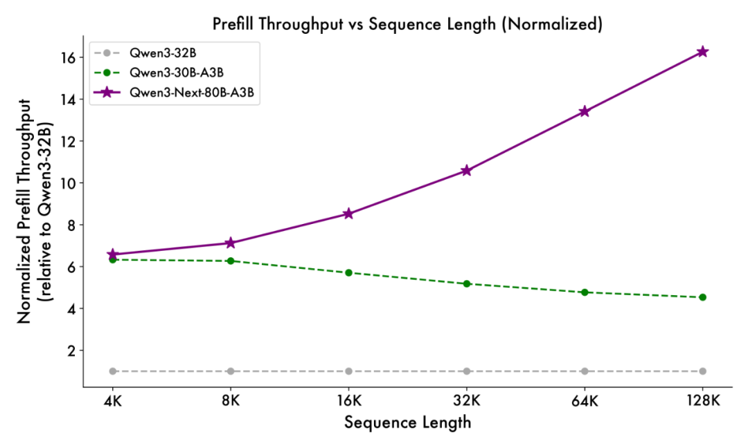 得益于创新的混合模型架构,Qwen3-Next 在推理效率方面表现出显著优势。与 Qwen3-32B 相比,Qwen3-Next-80B-A3B 在预填充(prefill)阶段展现出卓越的吞吐能力:在 4k tokens 的上下文长度下,吞吐量接近前者的七倍;当上下文长度超过 32k 时,吞吐提升更是达到十倍以上。