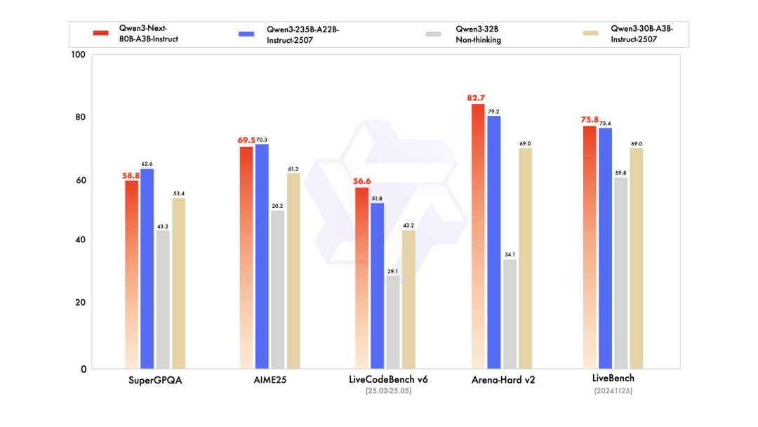 在编程(LiveCodeBench v6)、人类偏好对齐 (Arena-Hard v2) 以及综合性能力 (LiveBench) 评测中,Qwen3-Next-Instruct 表现甚至超过了千问的开源旗舰模型,并在包含通用知识(SuperGPQA)、数学推理(AIME25)等核心测评中全面超越了 SOTA 密集模型 Qwen3-32B;Qwen3-Next-Thinking 则全面超越了 Gemini2.5-Flash-Thinking,在数学推理 AIME25 评测中获得了 87.8 分。而达到如此高水平的模型性能,仅需激活 Qwen3-Next 总参数 80B 中的 3B。