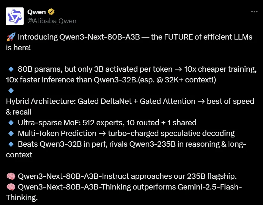 阿里Qwen3-Next开源:高效MoE架构,80B仅激活3B,训练成本直降9成,性能显著提升。