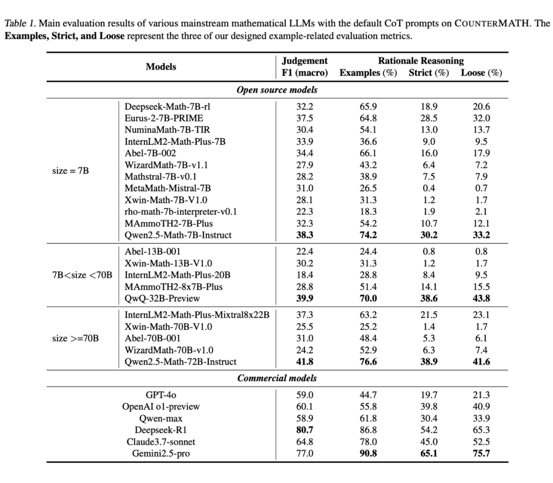 评估结果显示,包括OpenAI o1和多种开源模型在内的20余个主流数学大模型,在COUNTERMATH上的表现普遍不佳。即使是先进的闭源模型,在最基础的真假判断上准确率也仅约60%,而开源模型大多徘徊在30%-40%。更重要的是,大多数模型在“举反例”这一关键能力上严重滞后,尤其在拓扑和实分析等领域存在显著知识缺口。
