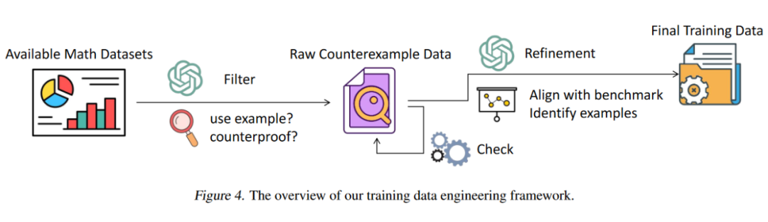团队提出了一个自动训练数据工程框架来获取训练数据。由于目前大多数 LLMs 无法提供令人满意的基于实例的数学证明,因此在数据收集时,我们从现有的人工编写的数据集中筛选数据,而不是直接生成反例数据。
