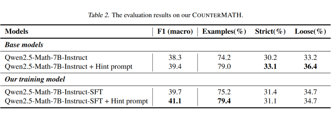 COUNTERMATH 上的评估结果。我们在 COUNTERMATH 上进行评估,希望证明这种举反例的方法能有效提高模型的高等数学概念推理能力。除了基座模型以外,我们还加入了与提示模型举反例的 hint prompt 的对比。
