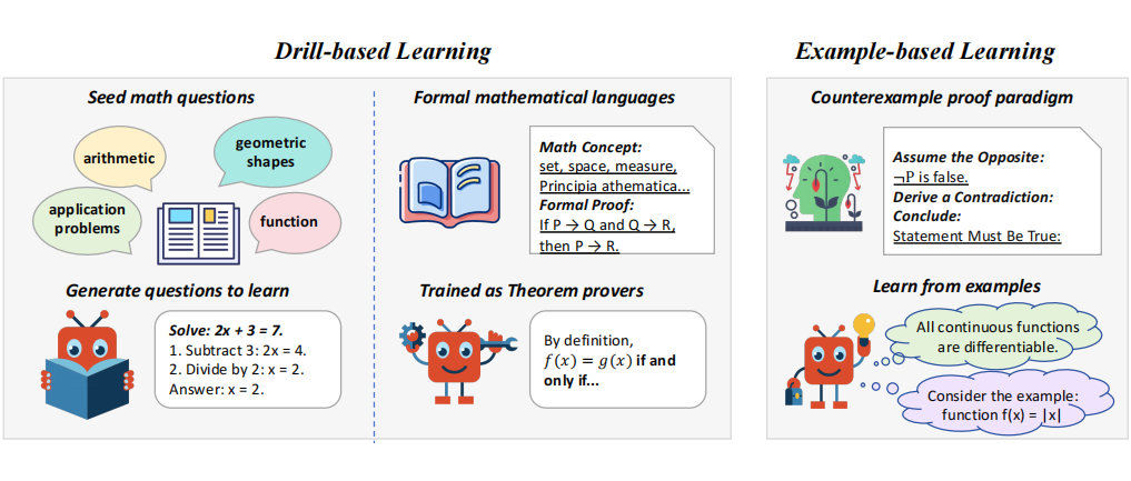 传统数学证明训练往往遵循让模型进行大量“刷题式”演练的范式:如图 1 所示,通过综合设计各种类型的题目,或者训练模型学习形式化的数学证明语言。然而,模型在遇到复杂数学概念时容易陷入“熟悉式”学习,仅仅只是记住了这些概念,而缺乏深层次的理解,因而难以在测试中灵活运用这些数学概念。